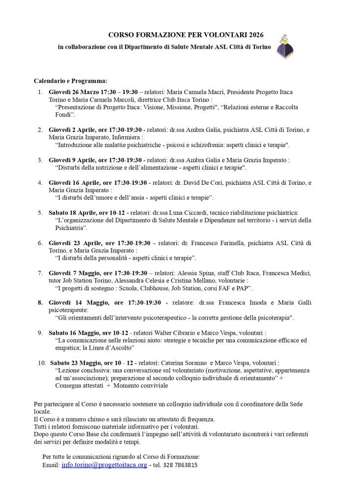 Il corso di formazione per volontari di Progetto Itaca a Torino ti offre gli strumenti, le competenze e il supporto per aiutare persone con disturbi come depressione, ansia, attacchi di panico e disturbi alimentari, e per sostenere le loro famiglie. Non serve avere esperienza sanitaria: serve passione, motivazione e desiderio di ascoltare e fare la differenza.
