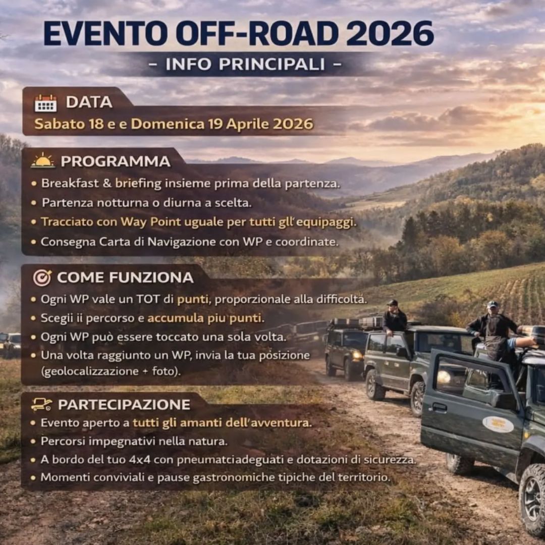Possono partecipare veicoli 4×4 in regola con il codice della strada, dotati di pneumatici adeguati per l’off road e attrezzatura di sicurezza