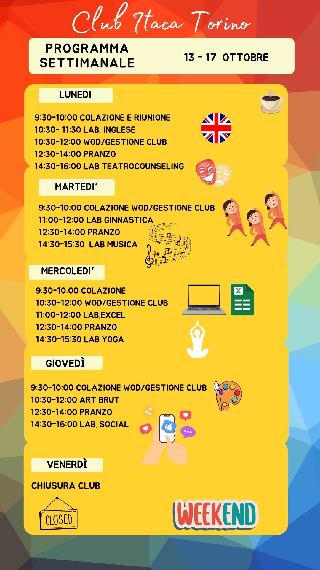 Il programma settimanale del Club Itaca Torino