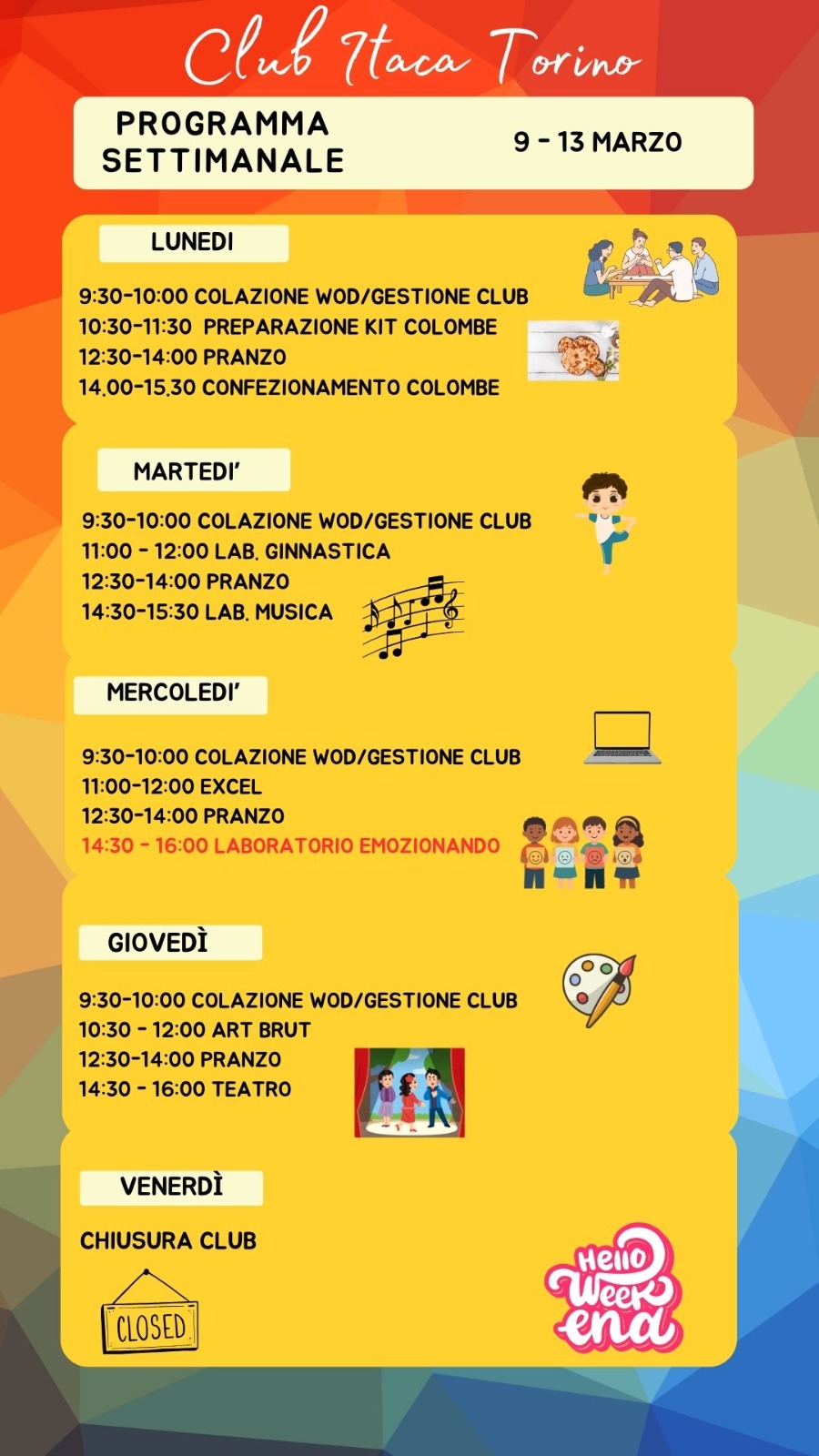 Scopri il programma settimanale del Club Itaca Torino! Partecipa alle nostre attività gratuite e condividi esperienze insieme a noi. Ti aspettiamo!